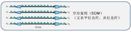 空分復(fù)用,通常被稱為并行光纖,是一種通過在復(fù)合鏈路中增加一條或多條光纖來增加一個或多個通道的方式。在這種情況下,一個通道實際上就是另一股光纖。這是上述時分復(fù)用通道的一個替代方案,在時分復(fù)用中,信號以按時間合并在同一條光纖上。行業(yè)中有很多應(yīng)用這種技術(shù)的例子。例如,40G SR4通過使用四通道或光纖,在多模光纖上提供40Gbps的速率。也就是在每個方向上有四個通道。這也正是“SR4”中4的含義,4個通道,每個10Gbps。