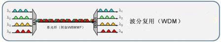 波分復(fù)用是通過由不同光的波長(顏色)隔離而成的多個通道上,經(jīng)復(fù)用器匯合和分離而同時發(fā)送信號的技術(shù)。顧名思義,用于傳輸?shù)牟ㄩL頻帶被分為多段,每段都能用作通信的信道。將多個信道擠出來作為一個小頻譜是可能的。用于長途、單模系統(tǒng)的常見版本叫做密集波分復(fù)用或粗波分復(fù)用。在多模系統(tǒng)中,短波分復(fù)用技術(shù)正在出現(xiàn)。