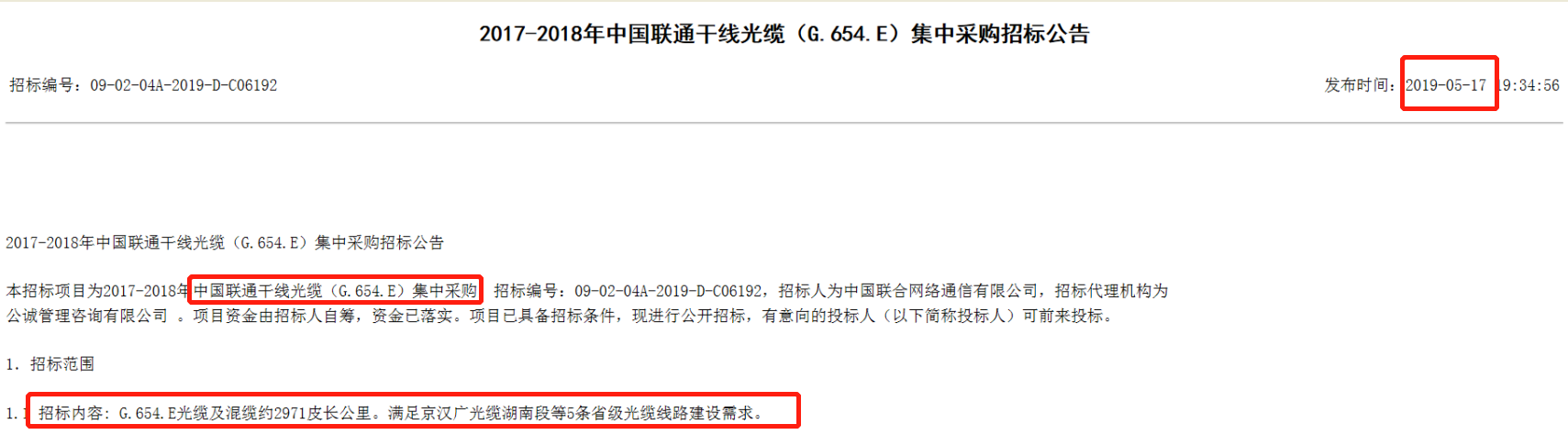 中國聯(lián)通2019年5月份G.654.E干線光纜集采招標(biāo)公告(圖)