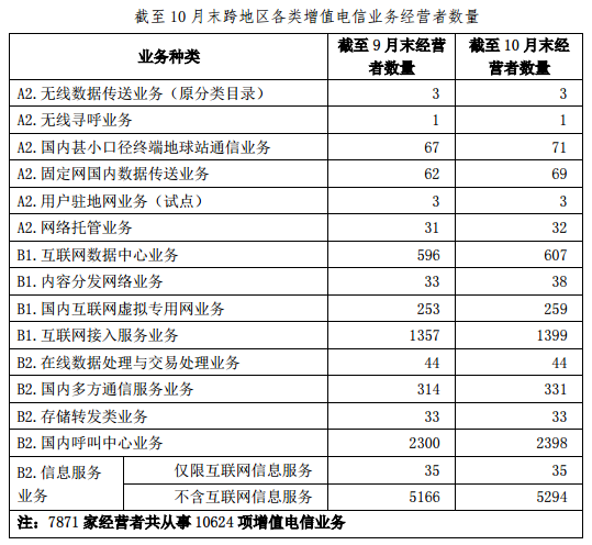 ICCSZ訊 近日,中國信通院發(fā)布了《國內(nèi)增值電信業(yè)務(wù)許可情況分析報(bào)告》。據(jù)報(bào)告稱,截至 2017 年 10 月底,全國增值電信業(yè)務(wù)經(jīng)營許可企業(yè)共 46632 家,其中工業(yè)和信息化部許可的跨地區(qū)企業(yè) 7871 家,各省(區(qū)、市)通信管理局許可的本地企業(yè)合計(jì) 38761 家,較上一月分別增長 1.50%、2.90%、1.22%。