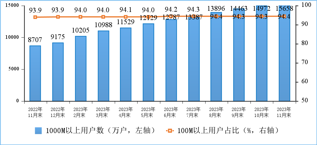 固定寬帶千兆接入用戶占比已近四分之一。截至11月末,三家基礎(chǔ)電信企業(yè)的固定互聯(lián)網(wǎng)寬帶接入用戶總數(shù)達(dá)6.36億戶,比上年末凈增4621萬戶。其中,100Mbps及以上接入速率的固定互聯(lián)網(wǎng)寬帶接入用戶達(dá)6億戶,占總用戶數(shù)的94.4%,占比較上年末提升0.5個百分點;1000Mbps及以上接入速率的固定互聯(lián)網(wǎng)寬帶接入用戶達(dá)1.57億戶,比上年末凈增6483萬戶,占總用戶數(shù)的24.6%。