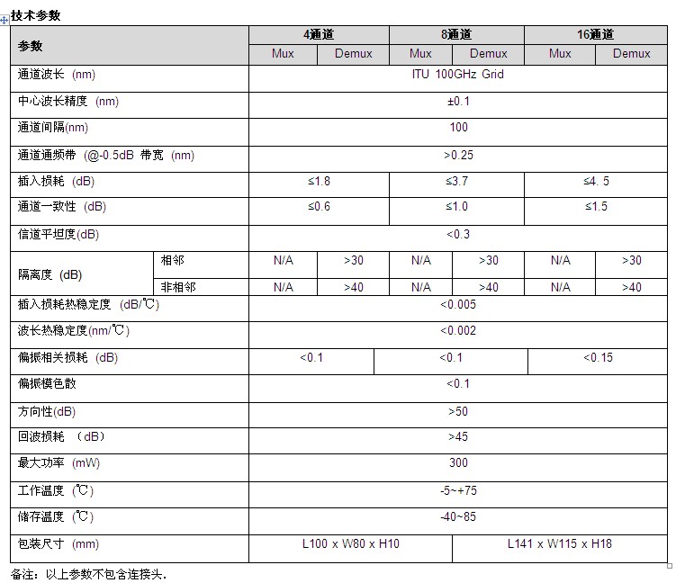 密集波分復(fù)用器是將不同波長的光信號(hào)復(fù)用至一根光纖上(復(fù)用),或?qū)?fù)用在一根光纖中的多個(gè)光信道按波長分開(解復(fù)用).100G信道間隔密集光波分復(fù)用器/解復(fù)用器采用成熟的多腔介質(zhì)膜實(shí)現(xiàn)光的濾波,波長穩(wěn)定性好,采用密封工藝封裝,環(huán)境穩(wěn)定性高.