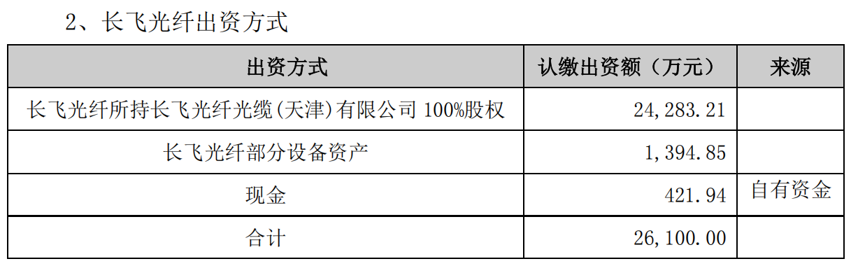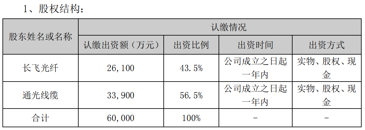 根據(jù)公告可知,合資公司注冊資本為6億元。其中,通光線纜持股56.5%,以旗下全資子公司江蘇通光信息有限公司、四川通光光纖有限公司的股權及現(xiàn)金出資,合計3.39億元;長飛光纖持股43.5%,以長飛光纖光纜(天津)有限公司股權、設備資產(chǎn)及現(xiàn)金出資,合計2.61億元。本次交易完成后,合資公司將會成為公司控股子公司,納入公司合并報表范圍。