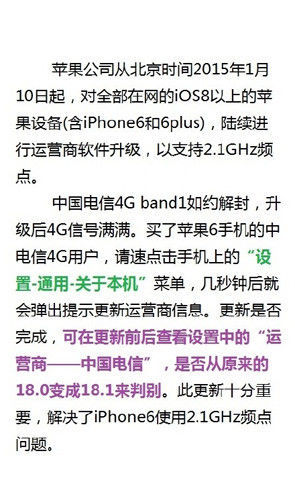 具體來(lái)說(shuō),電信版iPhone 6、iPhone 6 Plus用戶(hù)更新后可查看設(shè)置中的“運(yùn)營(yíng)商-中國(guó)電信”,是否從原來(lái)的18.0變?yōu)?8.1來(lái)判別。