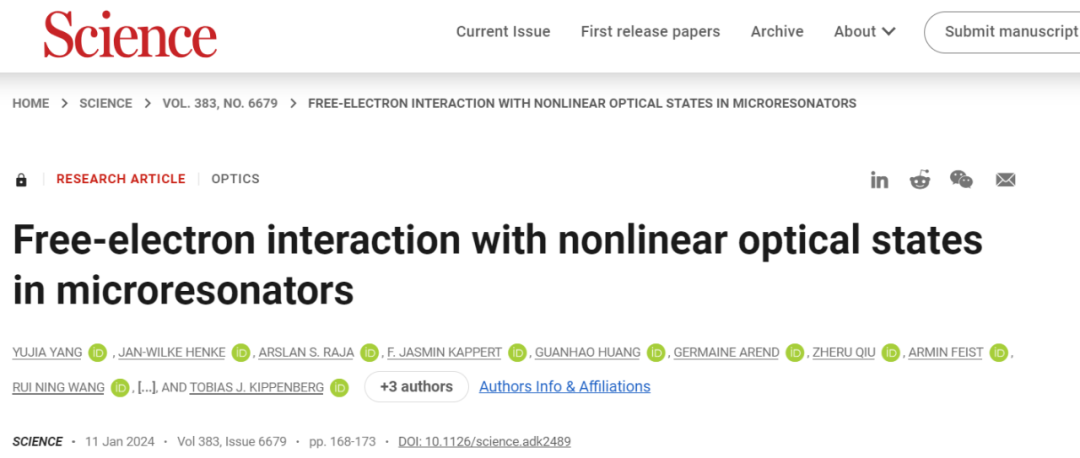最終,相關(guān)論文以《微諧振器中自由電子與非線性光態(tài)的相互作用》(Free-electron interaction with nonlinear optical states in microresonators)為題發(fā)在 Science[3]。