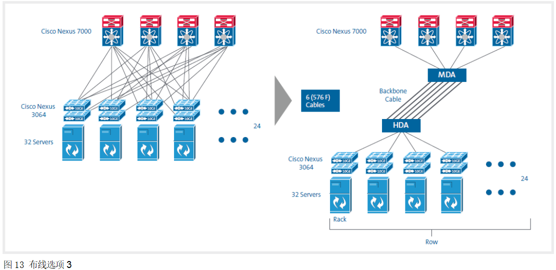 當(dāng)談到布線這個(gè)場景時(shí),我們有不同的選項(xiàng)。它們不一定都是不錯(cuò)的選項(xiàng),就像圖11所描繪的那樣,使用跳線超過3000條。最好是將跳線合并成48、72芯光纜,如圖12所示。甚至更好的是選項(xiàng)3:使用高芯數(shù)主干,每個(gè)576芯光纖,使我們從3000個(gè)跳線降到六個(gè)576芯主干光纜。請(qǐng)參閱圖13。