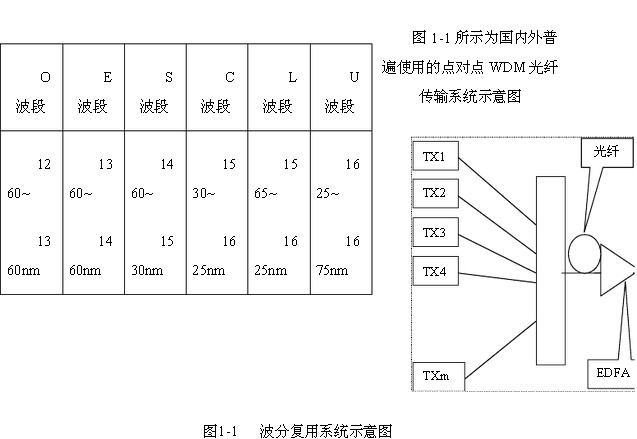 波分復(fù)用(WDM)技術(shù)是將兩種或多種不同波長(zhǎng)的光載波信號(hào)在發(fā)送端經(jīng)復(fù)用器(亦稱合波器,Multiplexer)匯合在一起,并耦合到光線路的同一根光纖中進(jìn)行傳輸?shù)募夹g(shù),在接收端,經(jīng)解復(fù)用器(亦稱分波器或稱去復(fù)用器,Demultiplexer)將各種波長(zhǎng)的光載波分離,然后由光接收機(jī)作進(jìn)一步處理以恢復(fù)原信號(hào)。這種在同一根光纖中同時(shí)傳輸兩個(gè)或多個(gè)不同波長(zhǎng)光信號(hào)的技術(shù),稱為波分復(fù)用技術(shù)。所以WDM技術(shù)可以在不增加光纖纖芯的情況下使傳輸容量成倍的增加。特別是密集波分復(fù)用的應(yīng)用使光纖的傳輸容量進(jìn)一步提高。原則上講,在光纖的低損耗窗口都可以進(jìn)行波分復(fù)用,但由于目前EDFA帶寬平坦的范圍在1530nm~1565nm,所以當(dāng)前使用的復(fù)用波長(zhǎng)大都在1550nm左右。ITU-T基于光纖的衰減譜對(duì)光纖的可用波段資源進(jìn)行了詳細(xì)的劃分,如表1-1所示,所以當(dāng)前密集波分復(fù)用系統(tǒng)主要工作在C波段(1530nm~1565 nm)。