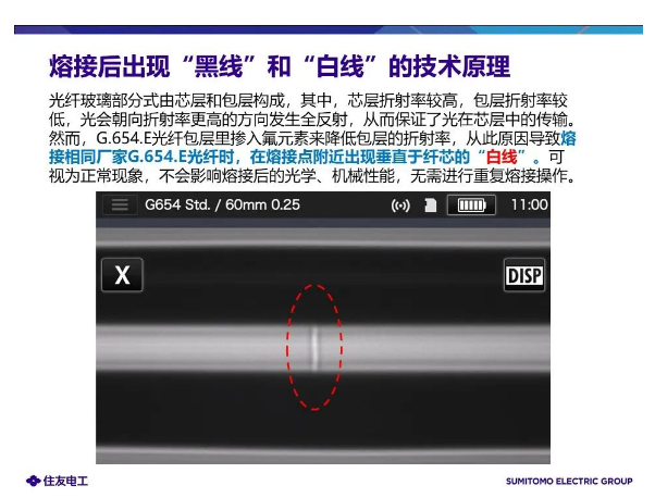 由于各光纖廠商的生產(chǎn)工藝不同,光纖結(jié)構(gòu)也不同,造成原有熔接程序的纖芯識(shí)別精度不夠穩(wěn)定。因此,住友電工通過(guò)高精度顯微鏡(觀察能力)精確地觀察纖芯部分,并且通過(guò)G.654.E專用熔接程序(運(yùn)算能力)自動(dòng)優(yōu)化熔接參數(shù),可顯著改善熔接質(zhì)量。