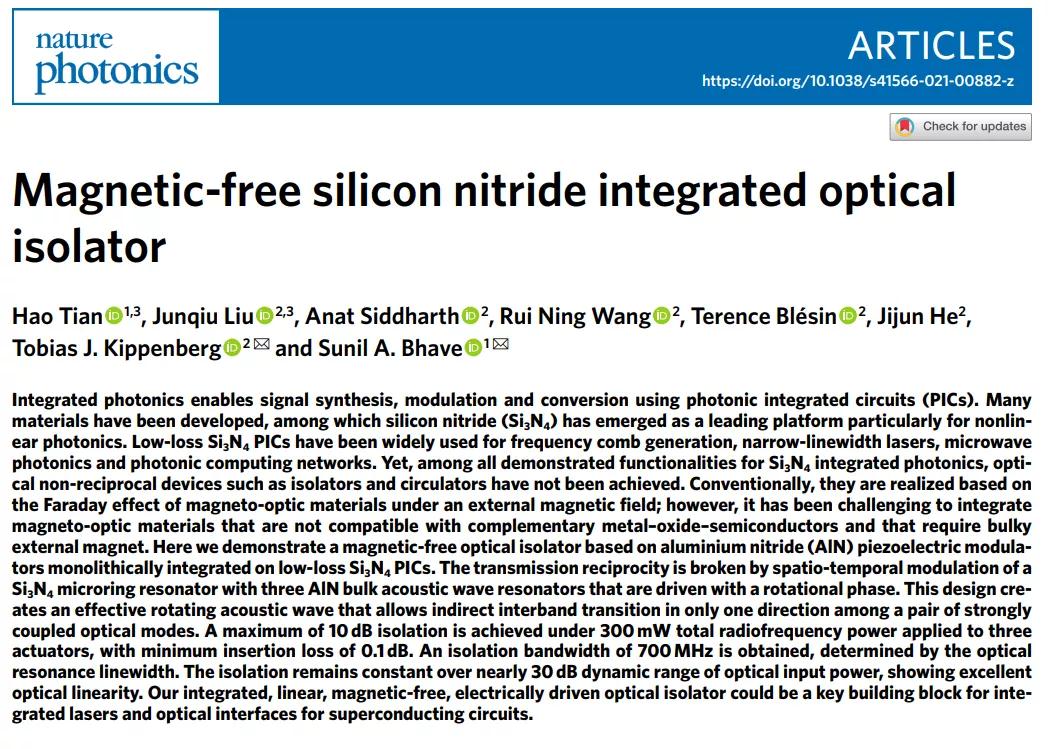 此項成果在 10 月 21 日以 Magnetic-FreeSilicon Nitride Integrated Optical Isolator 為題,發(fā)表在光學頂級期刊《自然-光子學》上,并同時在 MEMS 和光學領域獲得廣泛關注。美國普渡大學電子與計算機工程專業(yè)博士生田浩與瑞士洛桑聯(lián)邦理工學院(EPFL)劉駿秋博士為該篇文章的共同第一作者,洛桑聯(lián)邦理工學院教授 TobiasJ. Kippenberg 與普渡大學電子與計算機工程系教授 Sunil A. Bhave為共同通訊作者。此前,該項工作還在 2021 年的 IEEE MEMS 國際會議上獲得最佳學生論文的獎項,同時入選 2021 年國際光學會議 CLEO postdeadline 的會議報告。