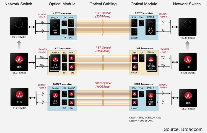 ICC訊(編譯:Nina)LightCounting在OFC2024之后更新了其PAM4和相干DSP報告。去年,模塊供應(yīng)商展示了第一批1.6T光模塊,今年DSP供應(yīng)商展望了第二代1.6T模塊設(shè)計。第一批1.6T模塊將16x100G主機(jī)接口連接到8x200G光學(xué)器件(16:8),而下一代設(shè)計將與即將推出的200G/通道(200G/lane)交換機(jī)ASIC配合使用,如圖頂行所示。博通在3月份的投資者活動中披露了其Sian2 1.6T 8:8 DSP,Marvell隨后在OFC宣布了其類似的Nova 2。MaxLinear不想被排除在1.6T的版圖之外,它預(yù)先發(fā)布了Rushmore,同樣以8:8的設(shè)計為目標(biāo)。盡管該公司沒有透露產(chǎn)品細(xì)節(jié),但它披露了三星代工廠是其Rushmore的制造合作伙伴,使其與使用臺積電代工的競爭對手不同。
