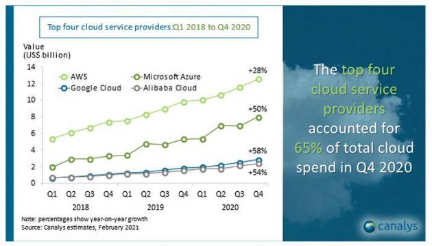 Canalys的數(shù)據(jù)顯示,排名第四的是阿里巴巴的云計算業(yè)務阿里云,它在全球云服務市場的份額為6%,它在2020年第四季度增長54%。