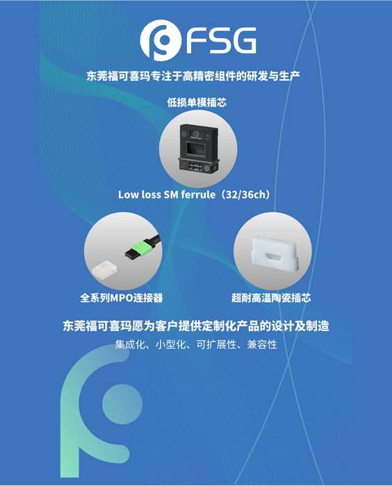 會(huì)場特設(shè)展位,東莞??上铂?/a>通訊科技有限公司(FSG)首次推出業(yè)內(nèi)領(lǐng)先,使用特殊材料實(shí)現(xiàn)超耐高溫插芯,并攜全新36/32通道單模低損插芯(Low loss SM ferrule)和全系列MPO散件亮相展位號A3,福可喜瑪愿為客戶提供全套定制化產(chǎn)品的解決方案,敬請前往展臺參觀交流!