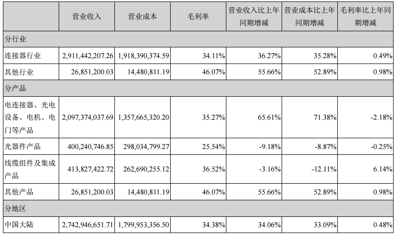 分產(chǎn)品情況看,中航光電光電設(shè)備、電連接器、電機(jī)、電門等產(chǎn)品營收20.97億元,同比增長65.61%,毛利率為35.27%;光器件產(chǎn)品營收4億元,同比下降9.18%,毛利率為25.54%;線纜組建及集成產(chǎn)品4.14億元,同比下降3.16%,毛利率36.52%。