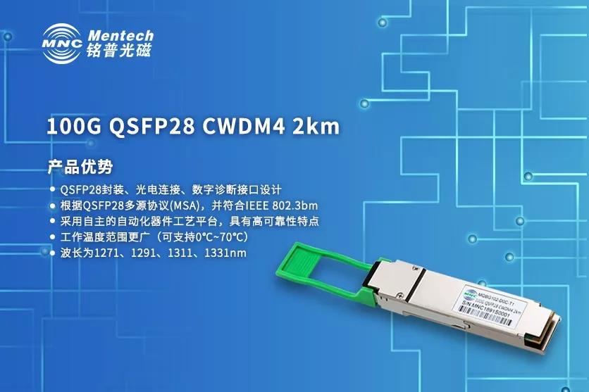 銘普光磁的100G QSFP28 CWDM4將四個發(fā)射器和接收器集成到一個模塊中。在發(fā)射機(jī)端,通過集成的光學(xué)多路復(fù)用器將四個波長合成在一起。在接收端,光數(shù)據(jù)通道的用集成光學(xué)解復(fù)用器進(jìn)行解復(fù)用。每個數(shù)據(jù)通道集成光電探測器和跨阻抗放大器,CDR。