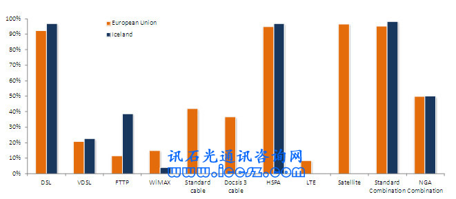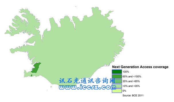 《2011歐洲寬帶覆蓋》調(diào)研報(bào)告顯示,冰島基本寬帶覆蓋率達(dá)98%,超高速寬帶覆蓋達(dá)50%(也稱(chēng)為NGA,即下一代接入)。在調(diào)研的29個(gè)國(guó)家中(歐盟27國(guó)和挪威、冰島),96%能夠獲得基本寬帶,超過(guò)50%(一半國(guó)家走向2020數(shù)字天堂目標(biāo))能夠獲得超高速。