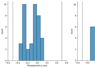 激光鍵合后的對準(zhǔn)精度在x和y維度上均達到500納米 圖源:Imec