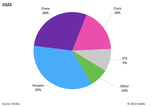 ICC訊(編譯:Nina)最近,Omdia發(fā)布了2022年第一季度的100G+相干光設(shè)備端口報(bào)告,該報(bào)告估計(jì)了波分復(fù)用(WDM)市場(chǎng)中100G和更高速率端口的出貨量。報(bào)告顯示,400G端口出貨量快速增長(zhǎng),而華為在2022年第一季度以35%的份額領(lǐng)跑全球400G波分市場(chǎng)。