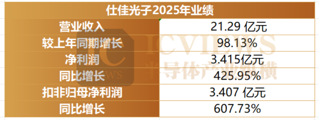 業(yè)績(jī)預(yù)告顯示,仕佳光子 2025 年預(yù)計(jì)實(shí)現(xiàn)營業(yè)收入約 21.29 億元,同比增幅達(dá) 98.13%;歸屬于上市公司股東的凈利潤(rùn) 3.415 億元,同比飆升 425.95%;扣非歸母凈利潤(rùn) 3.407 億元,增幅高達(dá) 607.73%。據(jù)公告披露,上年同期公司營收為 10.7453 億元,歸母凈利潤(rùn) 6493 萬元,扣非歸母凈利潤(rùn) 4814 萬元,2025 年各項(xiàng)核心財(cái)務(wù)指標(biāo)均實(shí)現(xiàn)翻倍式增長(zhǎng)(業(yè)績(jī)數(shù)據(jù)為公司財(cái)務(wù)部門初步測(cè)算結(jié)果)。