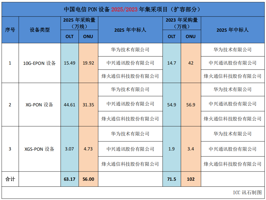 ICC訊 1月23日,中國(guó)電信公布2025年P(guān)ON設(shè)備集中采購(gòu)項(xiàng)目(擴(kuò)容部分),共采購(gòu)10G-EPON設(shè)備(OLT 15.49+ONU 19.92)35.41萬(wàn)線,XG-PON設(shè)備(OLT 44.61+ONU 31.35)75.96萬(wàn)線,XGS-PON設(shè)備(OLT 3.07+ONU 4.73)7.8萬(wàn)線;中標(biāo)人均為華為、中興、烽火三家。