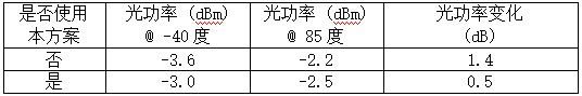 光模塊方案簡潔,補(bǔ)償效果好,控制方便。如果將此方案用到高速短距離模塊上,對光模塊的發(fā)射光功率這項指標(biāo)進(jìn)行對比測試,具體地,光模塊模塊室溫25度環(huán)境下,發(fā)射光功率-2.7dBm。補(bǔ)償控制單元對跟蹤誤差以25度為分段點(diǎn)進(jìn)行分段補(bǔ)償,25度至-40度采用負(fù)系數(shù),25度至85度采用正系數(shù)。