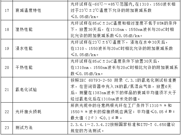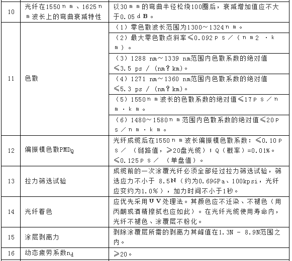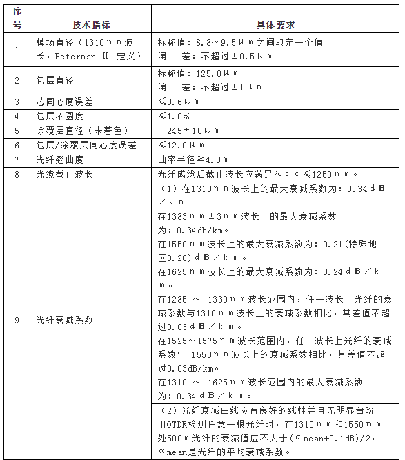 從技術(shù)指標(biāo)要求來(lái)看,模場(chǎng)直徑在標(biāo)稱值8.8~9.5μm之間,偏 差不超過(guò)±0.5μm,包層直徑標(biāo)稱值為125.0μm,偏 差不超過(guò)±1μm,芯同心度誤差≤0.6μm,指標(biāo)詳情見(jiàn)下表。