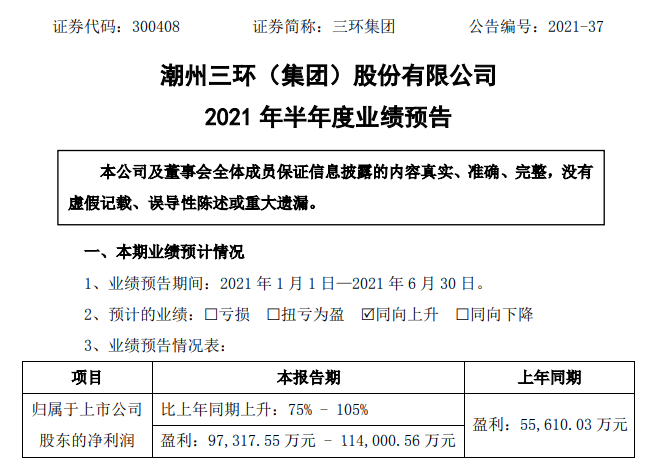 ICC訊 (編輯:Nicole) 潮州三環(huán)(集團)股份有限公司(以下簡稱“三環(huán)集團”或“公司”)發(fā)布2021 年半年度業(yè)績預告:預計業(yè)績同向上升,歸屬于上市公司股東的凈利潤97,317.55 萬元 - 114,000.56 萬元,同比增長75% - 105%,上年同期實現(xiàn)盈利55,610.03 萬元。