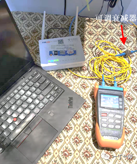 圖中,在入戶的皮線光纜與ONU間,用跳纖串接上可調(diào)衰減器和PON光功率計,這樣,就可以用PON光功率計在線測量出ONU的接收光功率(測試的下行光功率與ONU的收光功率相差約0.3dB1根跳纖減去一個活動連接的衰耗)。實際測試現(xiàn)場是這樣的。