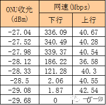 通過調(diào)節(jié)可調(diào)衰減器的衰減,可增加ODN鏈路的衰耗,使ONU的收光功率發(fā)生變化。網(wǎng)速的變化則通過筆記本用網(wǎng)線連接ONU進行測試。用該方法對老丁頭家300M的寬帶進行了測試,測試結(jié)果如下表。