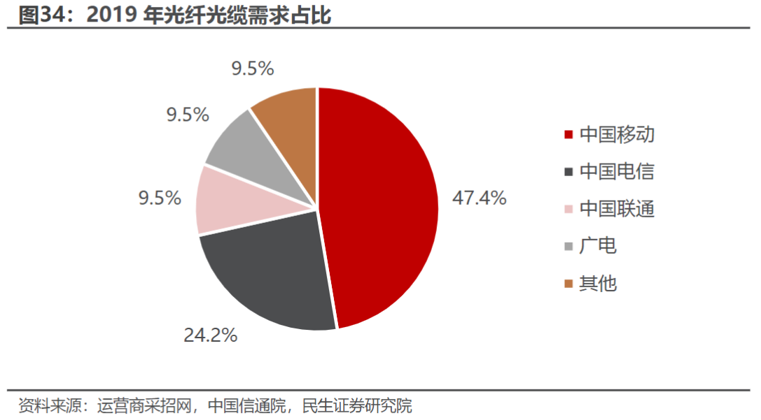 民生證券分析師馬天詣8月24日發(fā)布的研報(bào)指出,光纖下游應(yīng)用場景主要為電信市場和數(shù)據(jù)中心場景,三大運(yùn)營商為主要下游客戶。在通信產(chǎn)業(yè)鏈中,運(yùn)營商是光纜行業(yè)的主要下游客戶,2019年三大運(yùn)營商需求量占比達(dá)81%,其中中國移動(dòng)承擔(dān)國內(nèi)近一半需求。