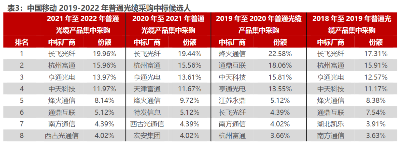以2018-2022年中國移動(dòng)普通光纜集采項(xiàng)目為例,除2019年外,長飛光纖中標(biāo)份額一直保持首位,亨通廣電、中天科技、烽火通信、通鼎互聯(lián)和特發(fā)信息等A股上市公司在集采中也保持較高份額。