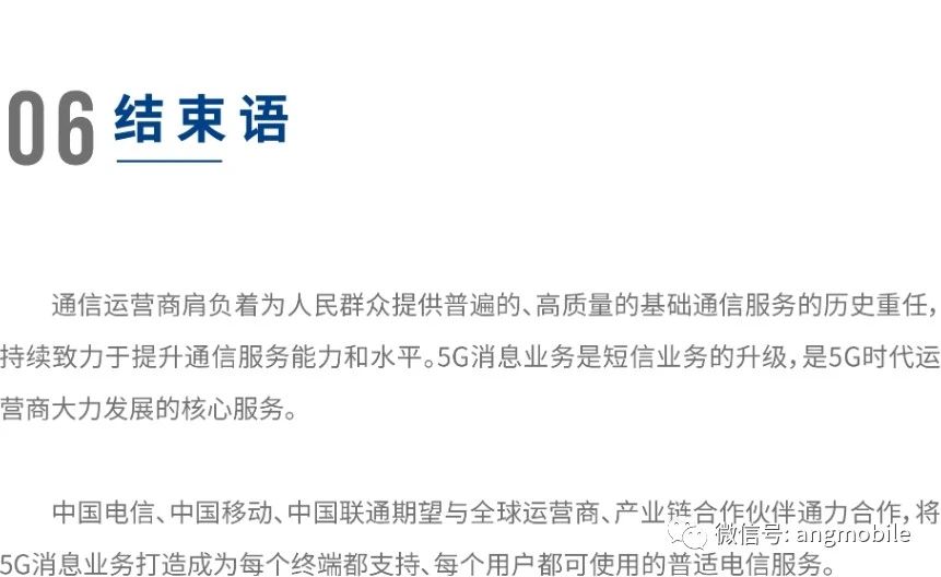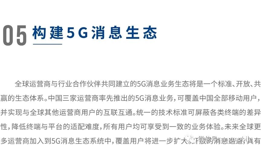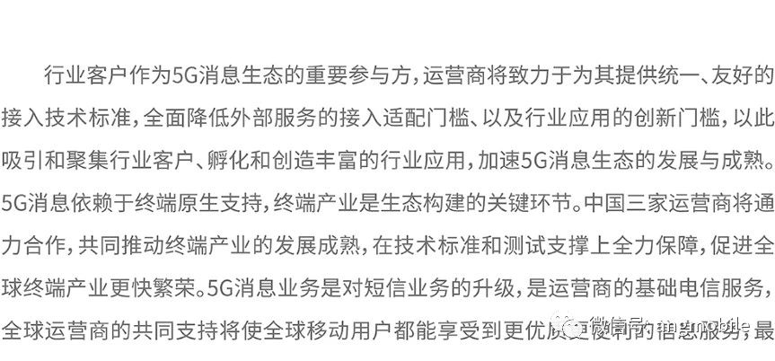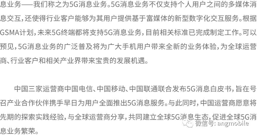 本次《5G消息白皮書》的發(fā)布,展現出三大運營商大力發(fā)展5G消息業(yè)務的能力與決心。下一步,中國移動、中國電信、中國聯通將與全球運營商、產業(yè)合作伙伴通力合作,將5G消息業(yè)務打造成為多終端支持、廣用戶覆蓋、多行業(yè)賦能的5G普適性信息通信服務,以促進消息類業(yè)務價值提升,驅動全球5G產業(yè)生態(tài)繁榮發(fā)展。