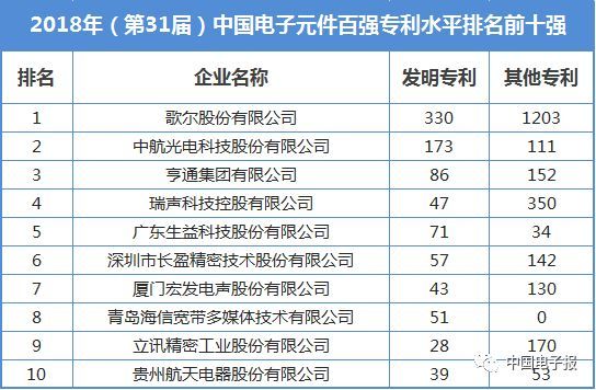 按照發(fā)明專利與其他專利2.5∶1的權(quán)重衡量本屆電子元件百強的專利水平,歌爾股份、中航光電和亨通集團三家公司跟前兩屆一樣,包攬了前三名。歌爾股份有限公司2017年獲得了330項發(fā)明專利和1203項其他專利,依然遠超諸強,連續(xù)三年授權(quán)專利數(shù)超千項,歌爾股份創(chuàng)造了電子元件百強的新紀錄。