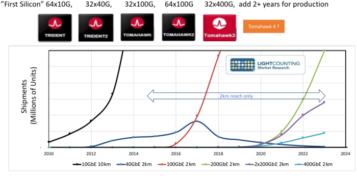 下圖顯示了第一個(gè)交換芯片的面世與數(shù)據(jù)中心中較流行的2公里以太網(wǎng)光收發(fā)器早期出貨量之間的相關(guān)性。100GbE的出貨在2016年達(dá)到頂峰--第一批32*100G博通Tomahawk交換芯片出樣后的兩年;2017年12月,32*400G Tomahawk3 ASIC出樣,因此200/2*200/400GbE的批量出貨預(yù)計(jì)將從2019年底開始,并在2020-2021年成為主流,其中大部分將是200GbE和2*200GbE,而真正的400GbE(2公里傳輸距離)將僅用于更高層級(jí)的交換。下圖也顯示了LC對(duì)200GbE、2*200GbE和400GbE的預(yù)測(cè),反映了頂級(jí)超大規(guī)模(Hyperscale)運(yùn)營(yíng)商在計(jì)劃上的分歧。