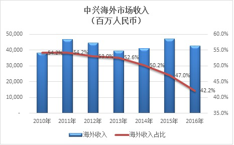 在營(yíng)收規(guī)模與競(jìng)爭(zhēng)對(duì)手拉開(kāi)差距的同時(shí),中興2016年在海外市場(chǎng)的銷(xiāo)售收入也同比下降了9%,在整體業(yè)務(wù)收入中的占比只有42%。把觀察范圍拉長(zhǎng),從下表中興海外市場(chǎng)收入從2010年到2016年間的變化情況來(lái)看,海外市場(chǎng)收入在整體收入中的占比一路下滑,已經(jīng)從當(dāng)年的過(guò)半數(shù)滑落到4成左右,而其總體規(guī)模也始終徘徊在400億人民幣上下而沒(méi)有進(jìn)一步的突破。