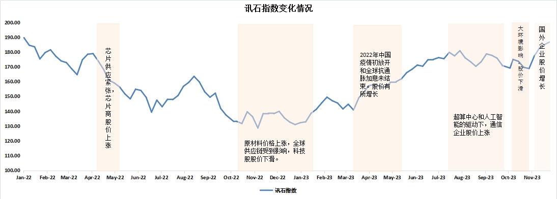 ICC訊 (編輯:Vicki)截止到11月30日,訊石統(tǒng)計的指數(shù)值為186.7,比上月的169.63增長了17.07,11月市場整體增長,呈現(xiàn)增長趨勢。11月指數(shù)增長主要是國外企業(yè)股價增長所致,11月美國道瓊斯指數(shù)和標普500指數(shù)比10月增長10%以上。云計算市場滲透率提升、全球流量暴漲,美國政府宣布擴大對華芯片出口限制,在去年頒布的對華芯片出口限制的基礎上,新規(guī)將更多類型的芯片納入出口管控范圍,根據(jù)最新的出口管制規(guī)定,除非英偉達從美國商務部獲得出口許可證,否則其無法出售用于 AI 訓練的推理芯片。本月訊石統(tǒng)計的芯片股指增長了12.39%。整體來看,訊石股指11月呈現(xiàn)增長趨勢。