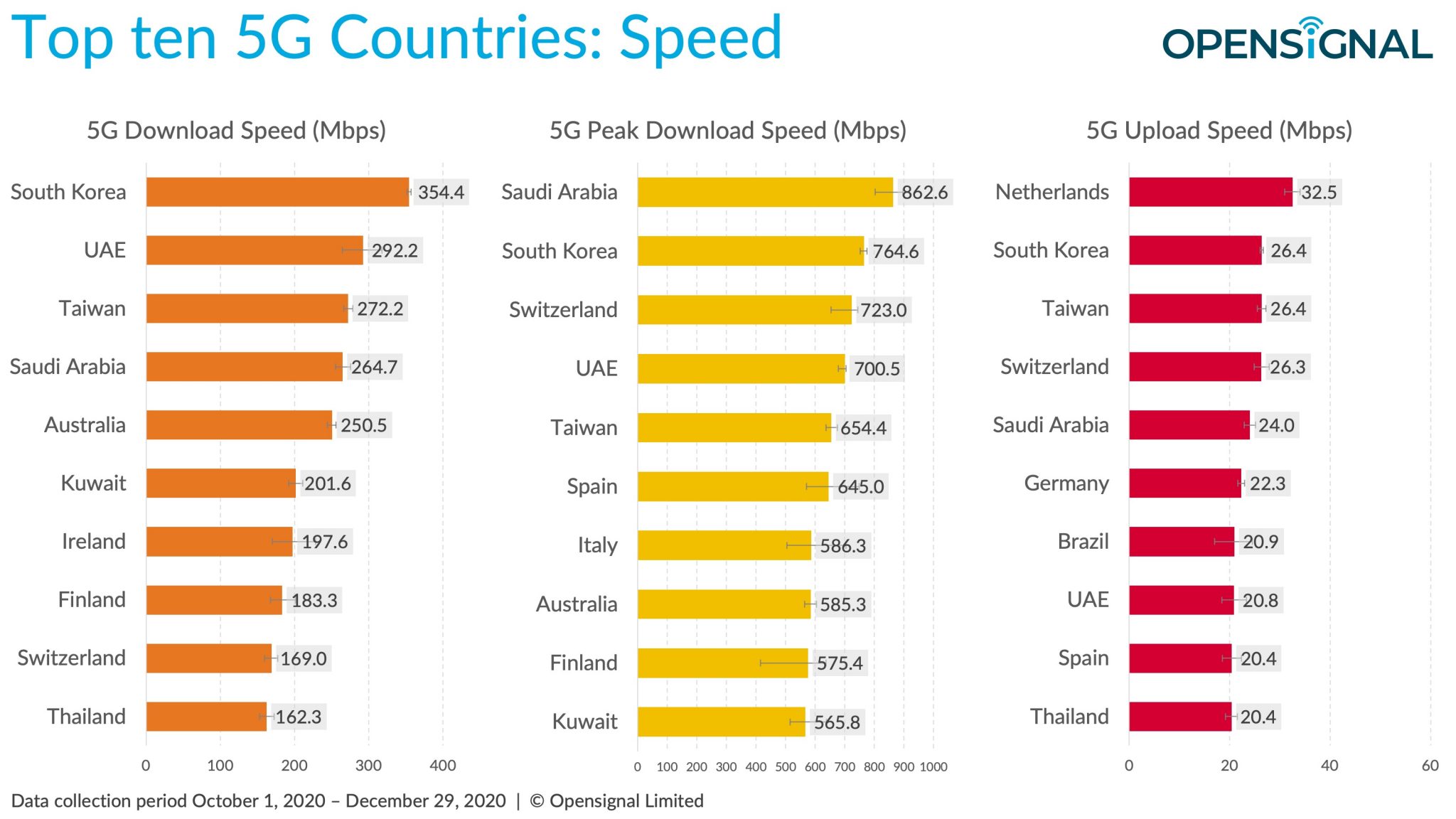 韓國(guó)用戶以354.4Mbps的下載速度在5G下載速度上領(lǐng)先世界。荷蘭以32.5 Mbps的速度位居5G上傳速度榜首。