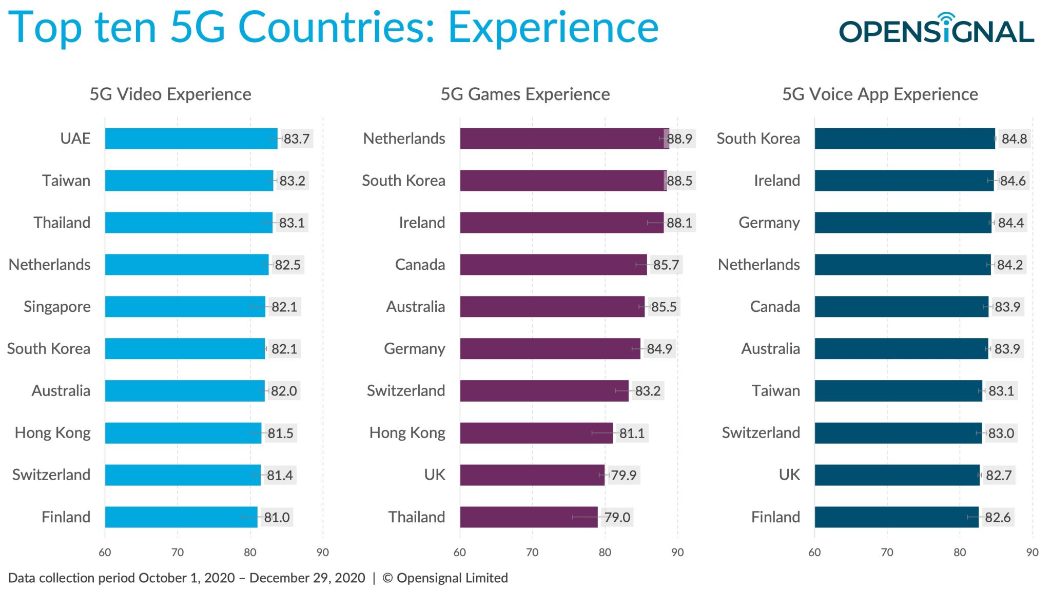 運(yùn)營(yíng)商希望說(shuō)服游戲玩家升級(jí)到5G,多人手機(jī)游戲業(yè)的期望一直非常高。但隨著越來(lái)越多的運(yùn)營(yíng)商部署5G核心網(wǎng)絡(luò)和獨(dú)立5G,這將是一個(gè)值得關(guān)注的領(lǐng)域。相比之下,在5G視頻體驗(yàn)排名前十的所有國(guó)家和地區(qū)得分都超過(guò)80分,體驗(yàn)“極好”。