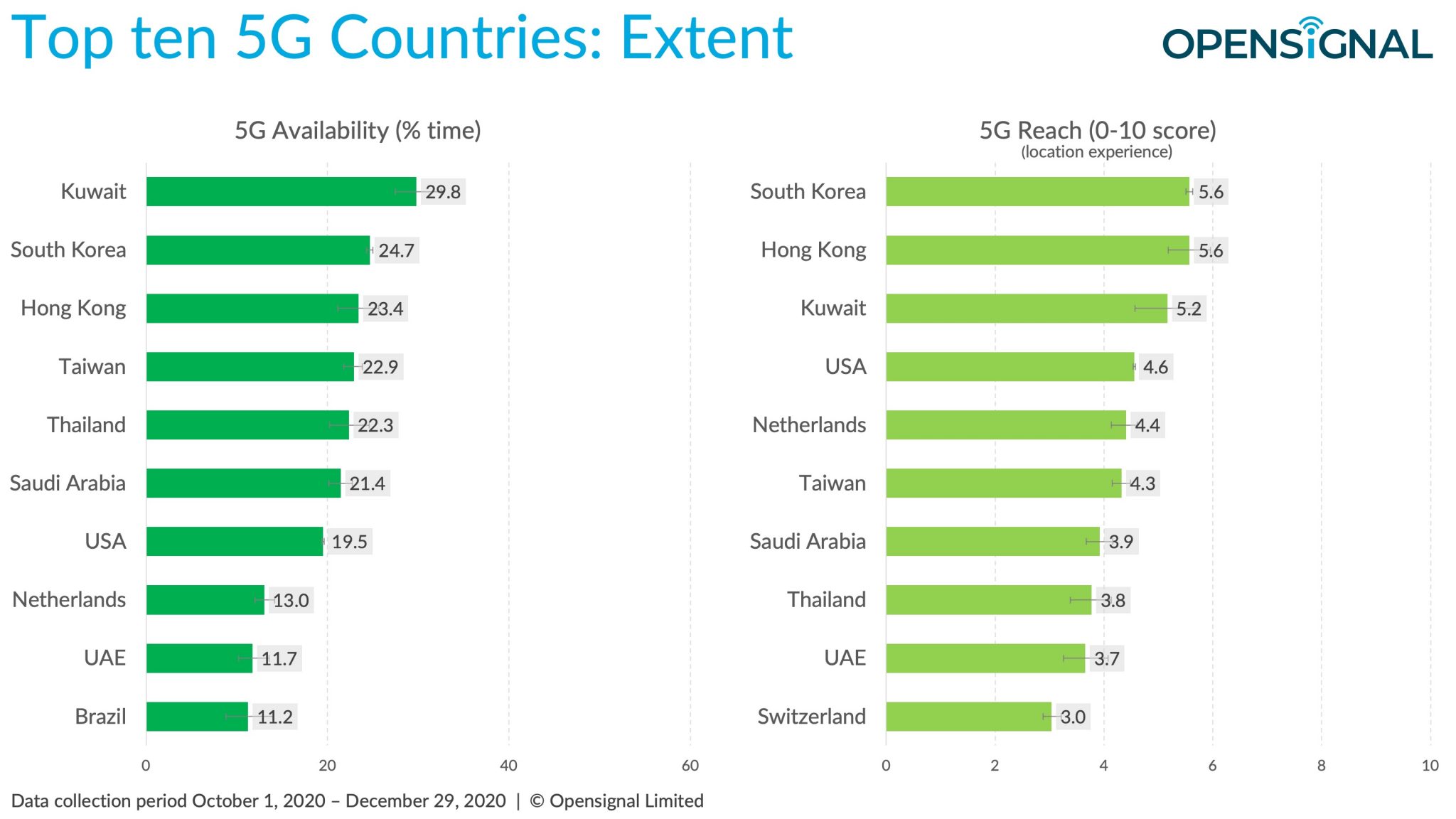 Opensignal還考察各國(guó)5G可用性和覆蓋率,以衡量用戶的真實(shí)體驗(yàn)。