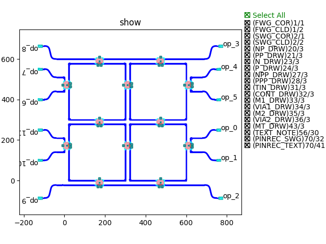 - 實(shí)例化MZI組件,并使用Linked類(lèi)進(jìn)行波導(dǎo)路由連接它們。
