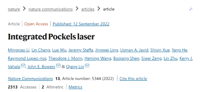 1.Li, M., Chang, L., Wu, L. et al. Integrated Pockels laser. Nature Communications 13, 5344 (2022). https://doi.org/10.1038/s41467-022-33101-6