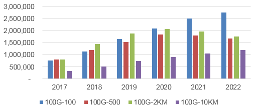 由于巨大的成本優(yōu)勢,多模模塊和多模光纖在數(shù)據(jù)中心內(nèi)海量使用。從LightCounting 2018年發(fā)布的光模塊發(fā)貨量趨勢來看(圖4),100G多模不斷上升,到2022年達(dá)到頂峰;400G多模100米、單模500米和2km三分天下。
