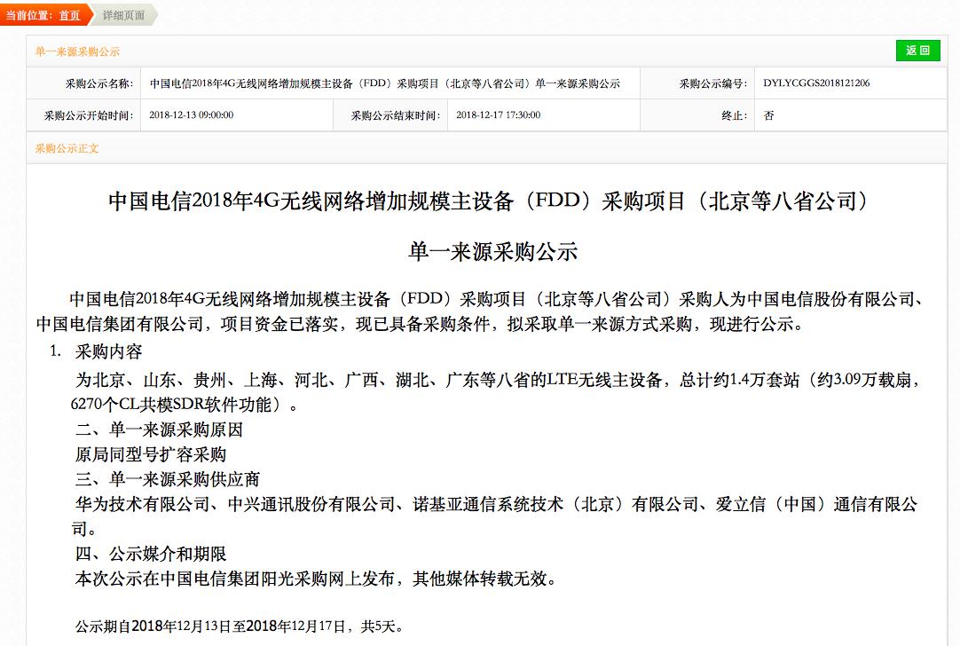 ICCSZ訊 近日,中國(guó)電信公示了2018年4G無(wú)線(xiàn)網(wǎng)絡(luò)增加規(guī)模主設(shè)備(FDD)采購(gòu)項(xiàng)目(北京等八省公司)單一來(lái)源采購(gòu)供應(yīng)商名單。此次共有四家企業(yè)入選。
