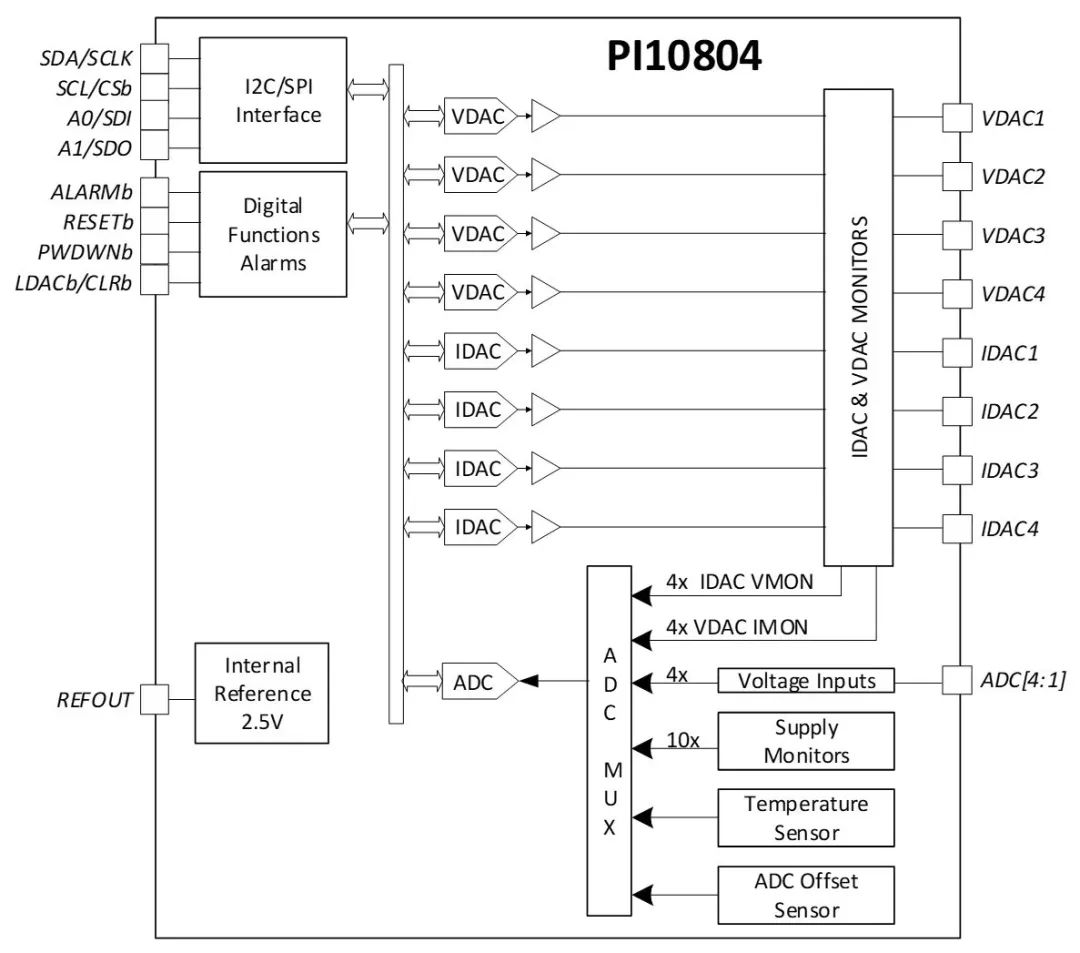 PI10804針對4路電吸收調(diào)制激光器的監(jiān)控功能而優(yōu)化設(shè)計, PI10804包含電流型DAC(IDAC),電壓型DAC(VDAC),多通道輸入ADC, 內(nèi)部參考電壓,串行通信接口以及錯誤告警和關(guān)斷功能。