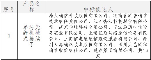 單芯光纖機(jī)械式接續(xù)子中標(biāo)企業(yè)包括烽火通信、康普通信等10家。