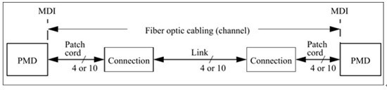 第二個(gè)原因是網(wǎng)絡(luò)速度不斷提升帶來(lái)的結(jié)果,就光纖而言,雙芯光纖可以支持百兆,千兆以及萬(wàn)兆的應(yīng)用,但不采用特殊的編碼和協(xié)議,兩芯光纖支持40G和100G就顯得困難了。還好IEEE工作組的200多名專(zhuān)家們經(jīng)過(guò)多年的努力推出了一個(gè)標(biāo)準(zhǔn)來(lái)支持這樣的應(yīng)用,這就是現(xiàn)在很多人知道的 IEEE802.3ba規(guī)范。研讀這本457頁(yè)的規(guī)范標(biāo)準(zhǔn),在里面對(duì)光纖布線傳輸?shù)亩x還是很容易找到,見(jiàn)下圖。我們可以看到單個(gè)通道為4芯或者10芯光纖,所以正常的40G和100G光纖網(wǎng)絡(luò)通訊就是8芯光纖和20芯光纖。這對(duì)傳統(tǒng)的數(shù)據(jù)通訊的雙芯光纖傳輸提出了挑戰(zhàn),即需要采用高密度多芯光纖了,但即使這樣也不見(jiàn)得一定要使用高密度多芯光纖預(yù)連接系統(tǒng)。