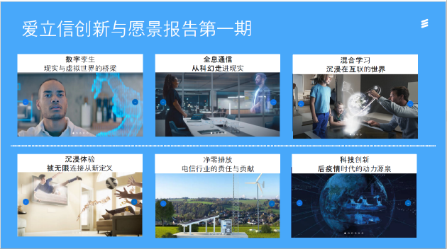基于上述暢想,愛立信對外公布了六個創(chuàng)新領(lǐng)域,包括數(shù)字孿生、全息通信、混合學(xué)習(xí)、沉浸體驗、凈零排放、科技創(chuàng)新。