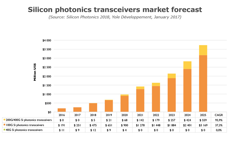 Yole公司多年來一直致力于硅光子行業(yè)的研究,并于2017年宣布硅光子市場即將起飛。今年,該趨勢預(yù)言得到了證實(shí),硅光子行業(yè)在數(shù)據(jù)管理和性能需求上具有廣泛吸引力。硅光子市場的預(yù)測令人印象深刻:Yole的分析師預(yù)言,到2025年,芯片級別的硅光子產(chǎn)品市場價值為5.6億美元,在收發(fā)器級別上市場價值近40億美元。硅光子技術(shù)已經(jīng)達(dá)到了許多積極信號的臨界點(diǎn):Yole通過Luxtera和Intel兩大廠商實(shí)現(xiàn)了收發(fā)器的批量出貨并且形成了成熟的供應(yīng)鏈。另外,Yole的分析師強(qiáng)調(diào)了新創(chuàng)業(yè)公司和額外產(chǎn)品進(jìn)入市場的發(fā)展趨勢,主要是針對100G,但是很快將達(dá)到200 / 400G。最后,從風(fēng)險投資界日益增加的投資角度來看,硅光子市場表現(xiàn)出非常令人鼓舞的跡象。