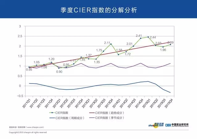特殊化的垂直行業(yè)所遭遇挫折更大,例如專業(yè)檢驗/檢測/認(rèn)證這一行業(yè), CIER指數(shù)只有0.78,換句話說當(dāng)你想換工作的時候,未必有一個崗位空著,市場根本就沒有需求。2015年第四季度,快消、汽車/摩托車、耐用消費品等行業(yè)需求首次出現(xiàn)負(fù)增長,分別為-7%、-9%和-12%。行業(yè)負(fù)增長了,自然用工需求也就出現(xiàn)負(fù)增長。所以這些行業(yè)的從業(yè)者,就不要輕舉妄動了。