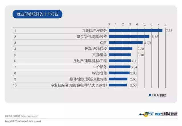 相比于互聯(lián)網(wǎng)的無線繁榮,其他行業(yè)的差距著實有些大。就業(yè)形勢排名第二的金融行業(yè),崗位和申請者之比達到了5.72,要落后互聯(lián)網(wǎng)不少,相當(dāng)于每個求職者少了兩個崗位的選擇空間。但整體來看仍有蓬勃發(fā)展之勢,金融行業(yè)里基金/證券/期貨/投資這個行業(yè)最近幾年的流動性與日俱增,主要也是受到了互聯(lián)網(wǎng)的顛覆影響,再加上新三板掛牌,民間咨詢公司雨后春筍,P2P火爆極大的刺激了人才需求。大量體制內(nèi)的優(yōu)秀人才,都蠢蠢欲動,準(zhǔn)備跳到體制之外。而一些跨界做金融的互聯(lián)網(wǎng)公司,也愿意付出巨大的成本去招兵買馬。金融行業(yè)用工需求數(shù)據(jù)顯示,金融行業(yè)今年第四季度金融業(yè)的人才需求同比增加28%,在全國平均增幅10%的基礎(chǔ)上仍位列就業(yè)第一梯隊。如果你是金融行業(yè)的從業(yè)者,那么應(yīng)該恭喜,現(xiàn)在正是您開口要價的好時機。