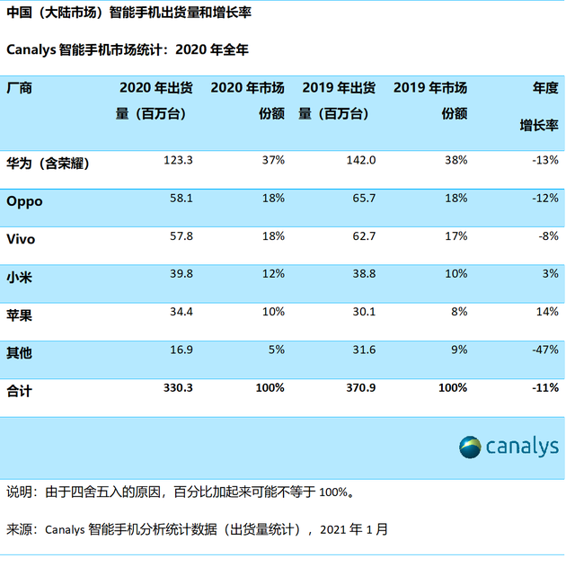 2020年第四季度,華為(包括榮耀)市場份額從2020年第三季度的41%下降至22%。
